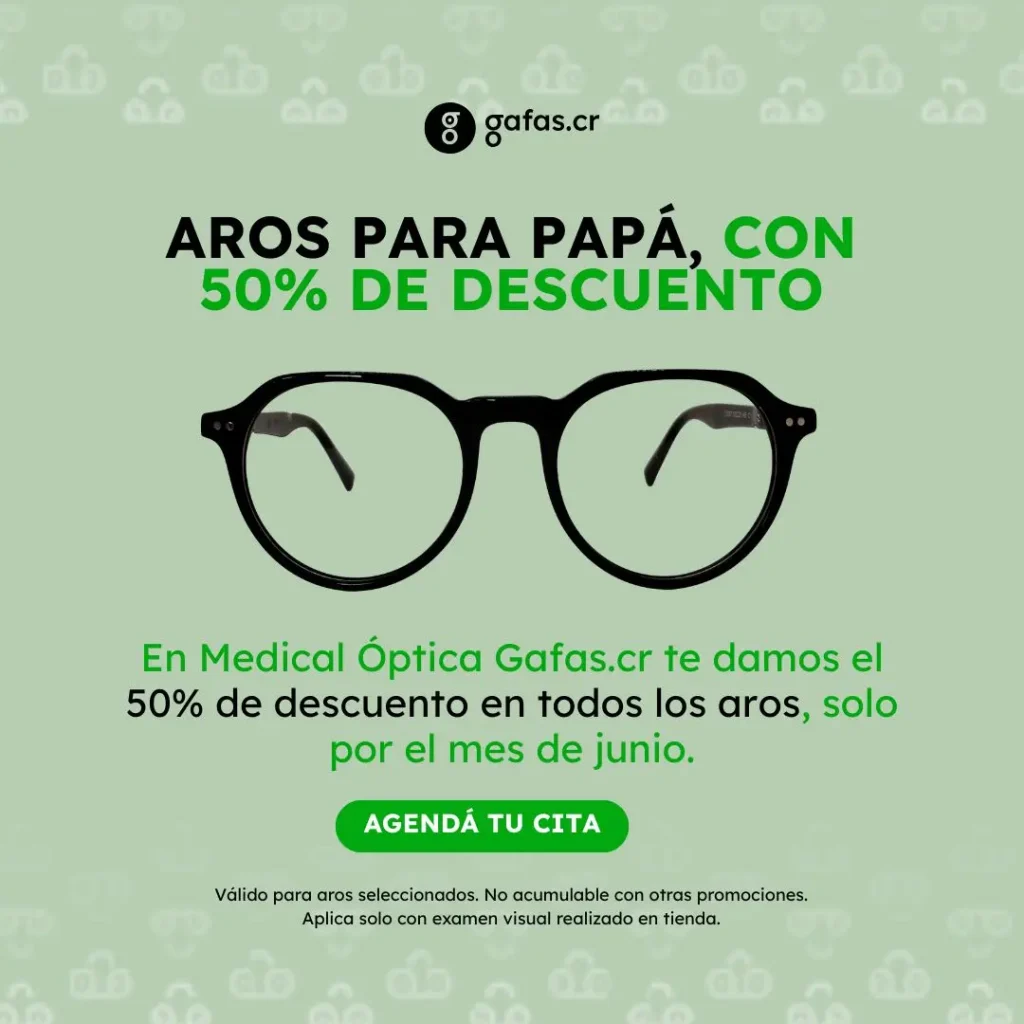 La oferta incluye 50% de descuento en aros seleccionados aplicable con examen de vista realizado en tienda. No acumulable con otras promociones. Válido hasta el 30/06/2025. Oferta únicamente disponible en los centros de Medical Óptica gafas.cr